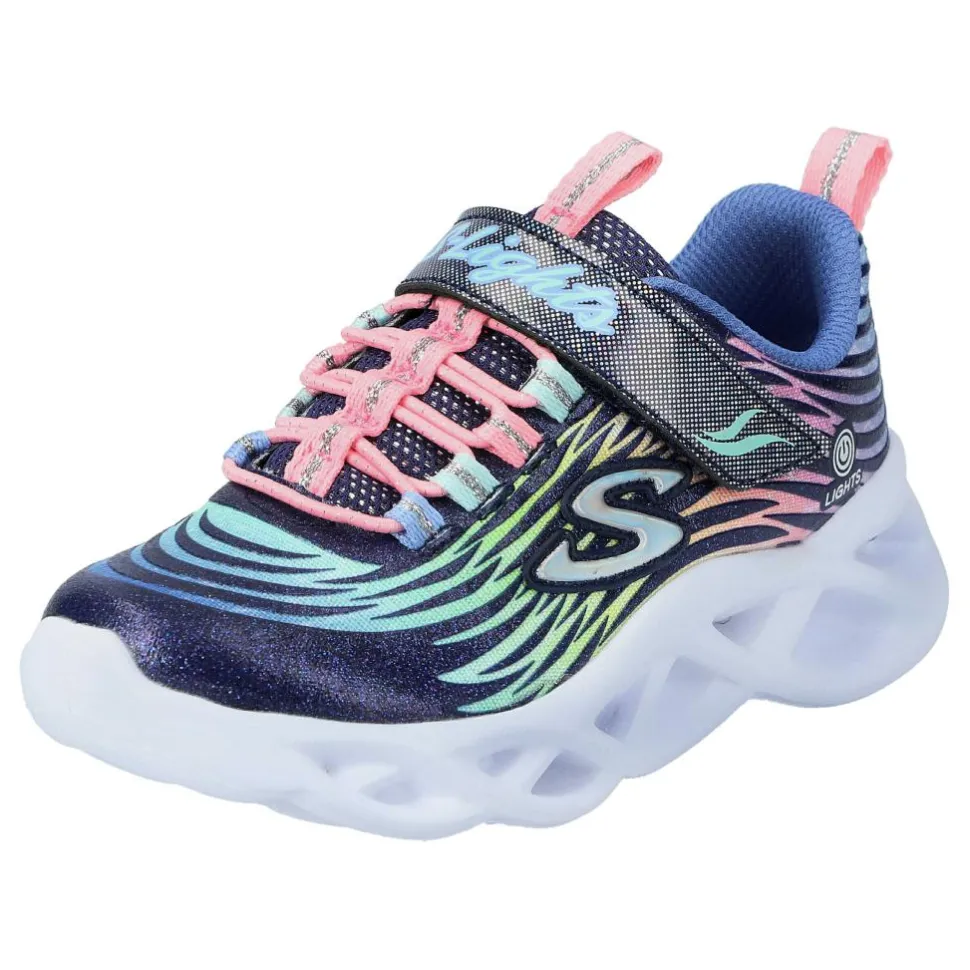 Bunte Kinder-Sneaker von Skechers mit Blinkeffekt bei jedem Schritt mit ON/OFF-Schalter. Durch die angedeutete Schnürung aus Elastikbändern muss nicht geschnürt werden und das An- und Ausziehen wird zum Kinderspiel.
