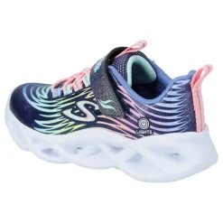 Bunte Kinder-Sneaker von Skechers mit Blinkeffekt bei jedem Schritt mit ON/OFF-Schalter. Durch die angedeutete Schnürung aus Elastikbändern muss nicht geschnürt werden und das An- und Ausziehen wird zum Kinderspiel.